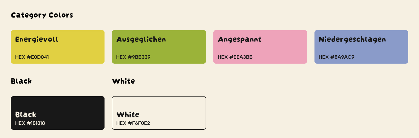 Stattdessen entwickelte ich eine einfache, übersichtliche Lösung, die es User:innen ermöglicht, schnell und intuitiv zwischen allen Stimmungskategorien zu wechseln, ohne viele Klicks.