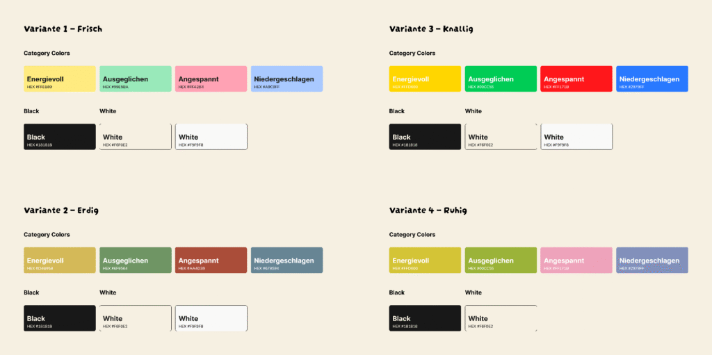 Die Entwicklung einer passenden Farbwelt war herausfordernd: Viele Kombinationen wirkten entweder zu kindlich, zu trist oder zu grell. Schliesslich entschied ich mich für eine frische, ruhige und aktivierende Palette mit sanftem Rosaton statt kräftigem Rot. So entstand eine harmonische Farbwelt, die das gewünschte App-Feeling unterstützt.
