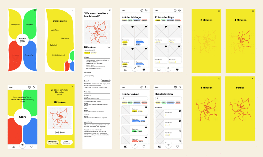 Der Schwerpunkt liegt auf einem durchdachten und visuell ansprechenden UX/UI-Design, das eine intuitive Nutzung ermöglicht. Dabei sollen sowohl die visuelle Stimmungsauswahl als auch die Darstellung der Teevorschläge eine ansprechende, harmonische Wirkung haben.