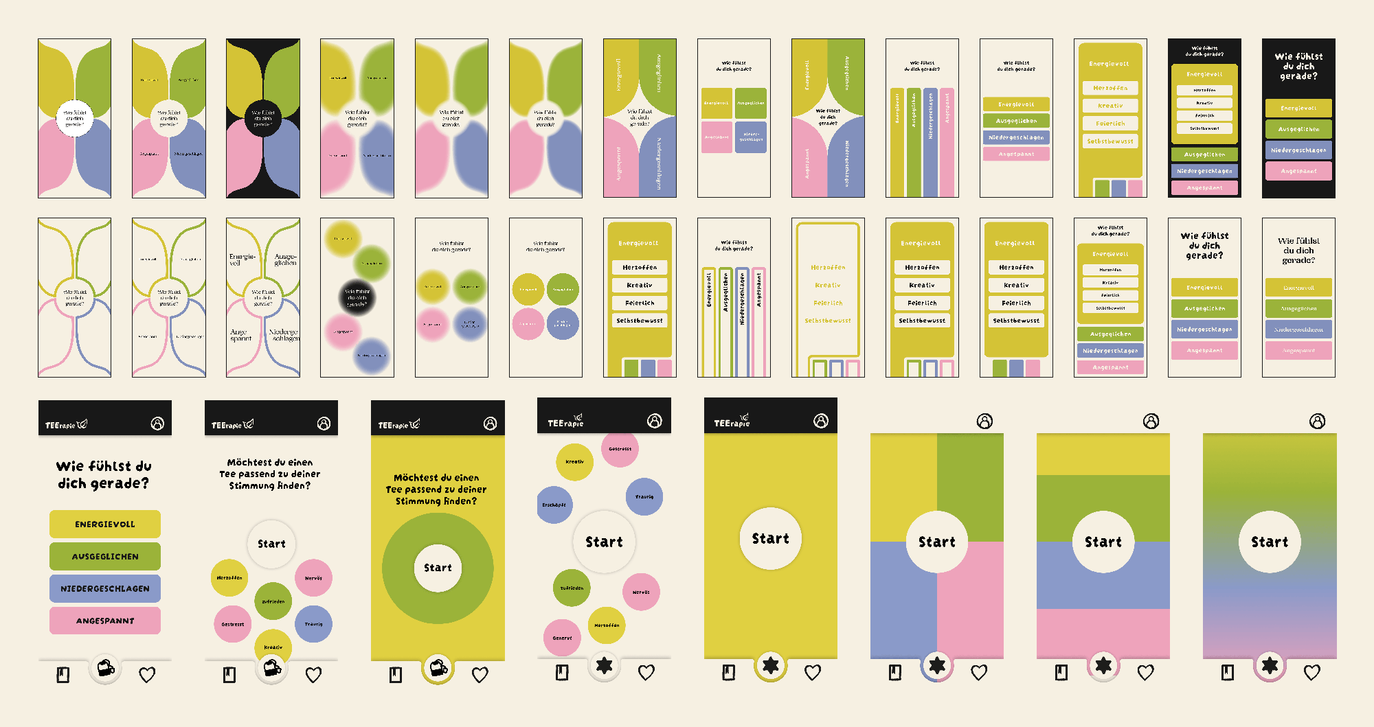 Die gestalterische Herausforderung war es, die Farben der Stimmungskategorien ohne Farbverläufe aufzunehmen. Die Lösung war ein Kreis-Design, das symbolisch die Ausbreitung der Teewirkung im Körper darstellt und inspiriert ist von der Färbung von Tee im Wasser.