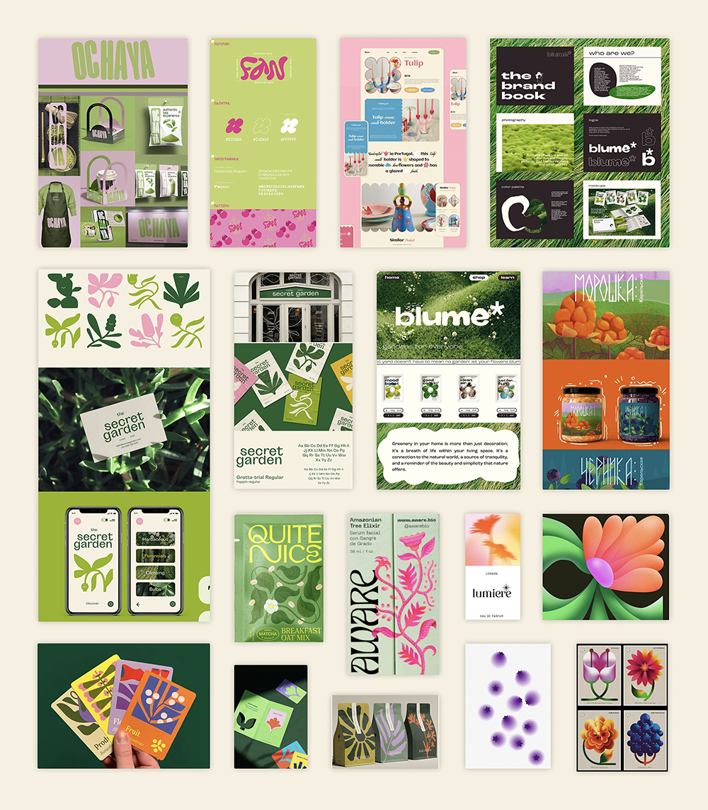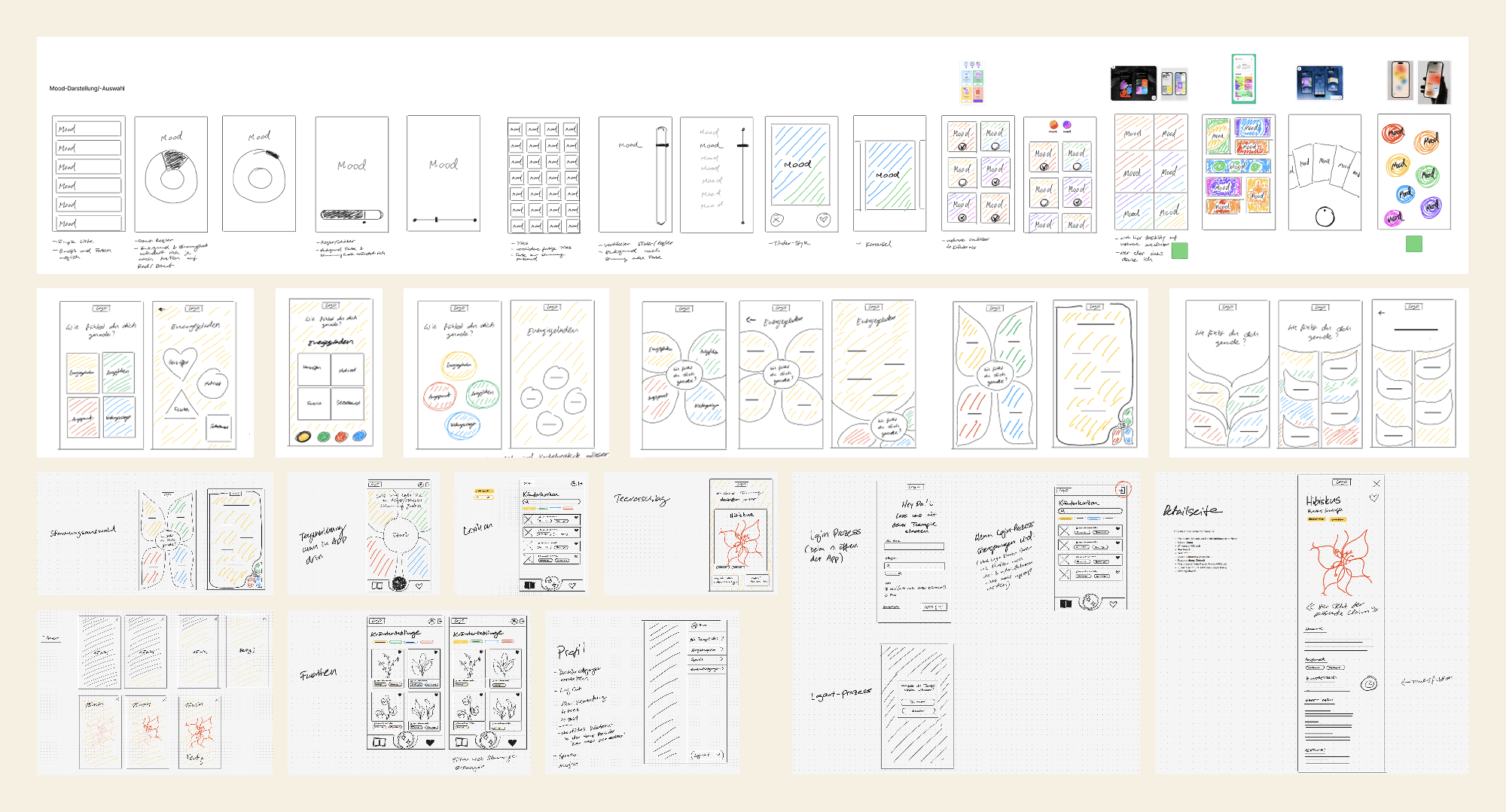 Inspiriert von meinem Moodboard plante ich einen abstrakten oder realistischen Illustrationsstil mit Verläufen, doch dieser passte nicht zum gewünschten App-Feeling und der Schrift. Nach mehreren Versuchen kam ich auf den handgezeichneten, konturierten Stil, der die Handschriftlichkeit der Typografie aufgreift.