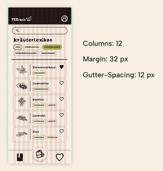 Eine gestalterische Herausforderung war die Darstellung der Detailseiten von Kräutern, die zu mehreren Stimmungskategorien passen. Um dies übersichtlich zu lösen, entwickelte ich zusammen mit meinem Mentor die Idee von Tabs innerhalb der Detailseiten. Je nach Stimmung wechselt die Farbe und die zugehörige Kräuterinfo.