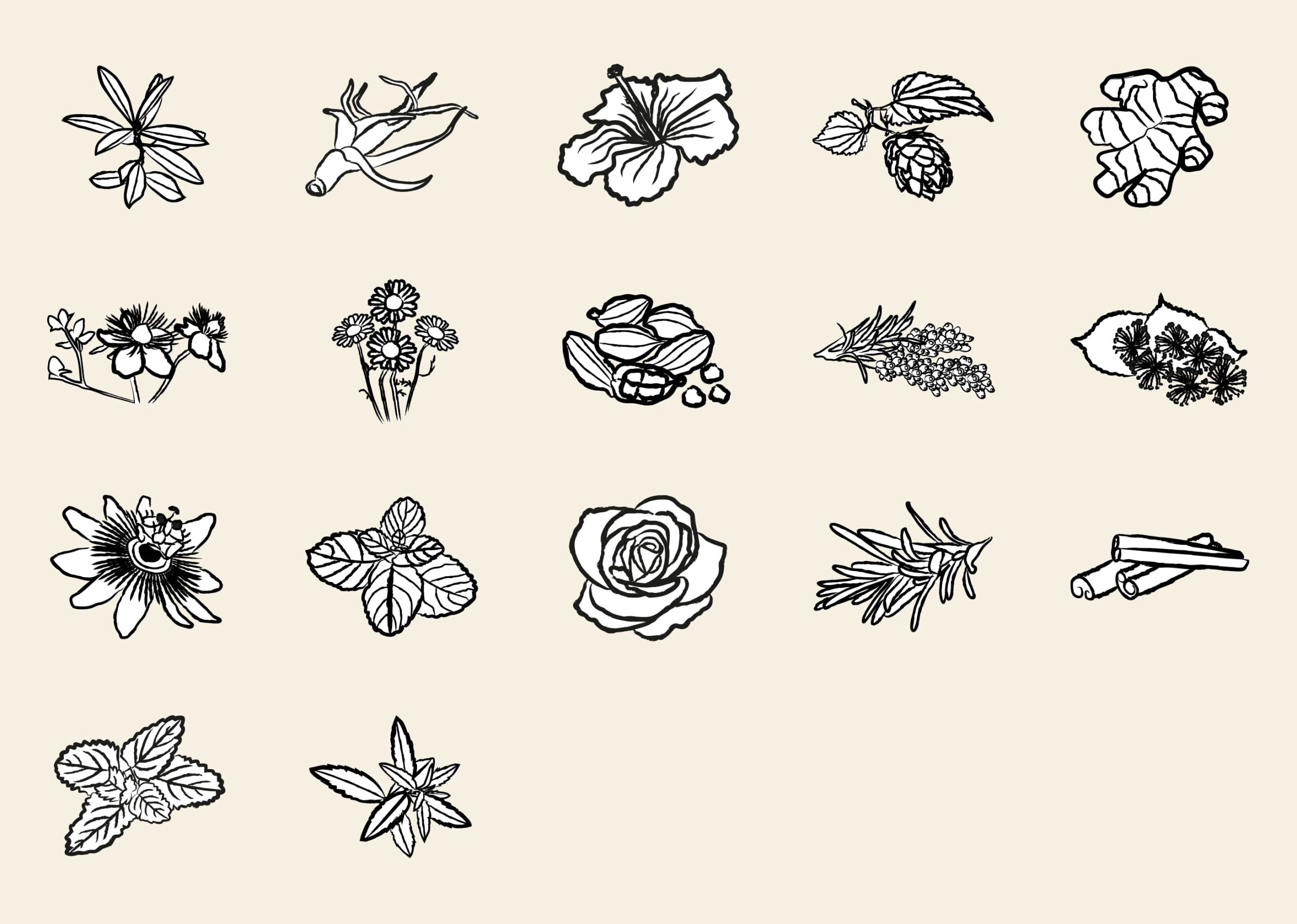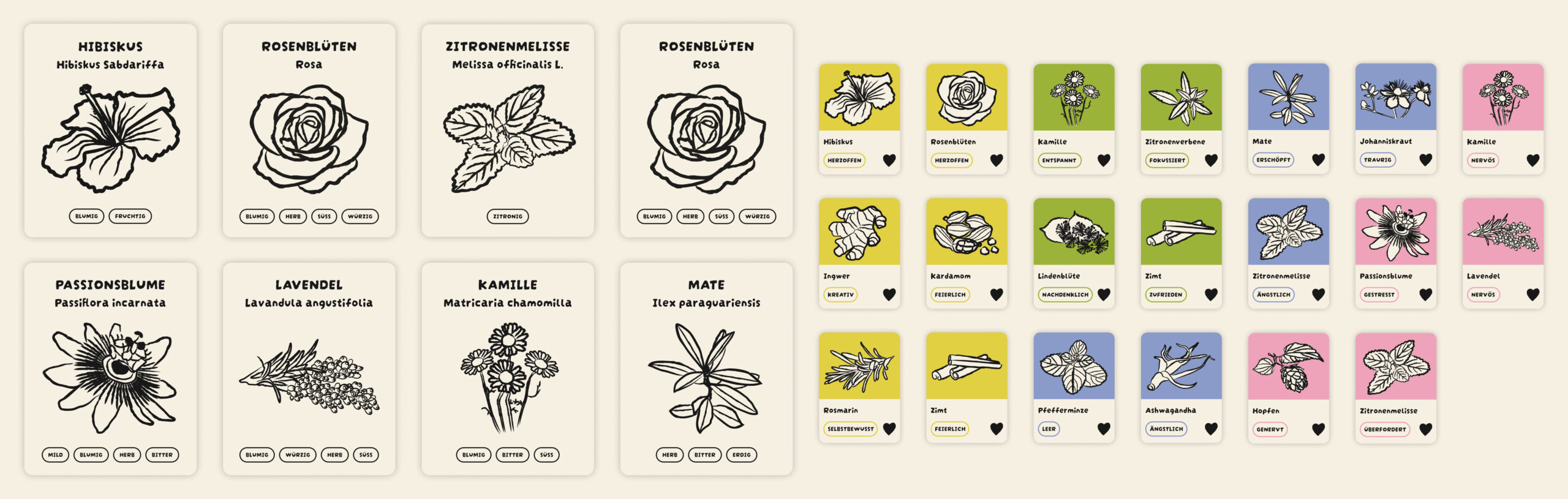 Im Laufe des Designprozesses merkte ich, dass die Kräuter-Illustrationen auf den farbigen Hintergründen weiss gefüllt deutlich besser wirken. Diese Erkenntnis kam jedoch spät, sodass ich nochmals Zeit investieren musste, um alle 16 Illustrationen entsprechend anzupassen.