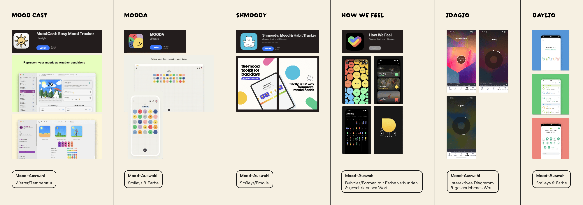 Ziel war es, mir Wissen über bestehende Herangehensweisen anzueignen und daraus Erkenntnisse für die Gestaltung der Mood-Auswahl abzuleiten.