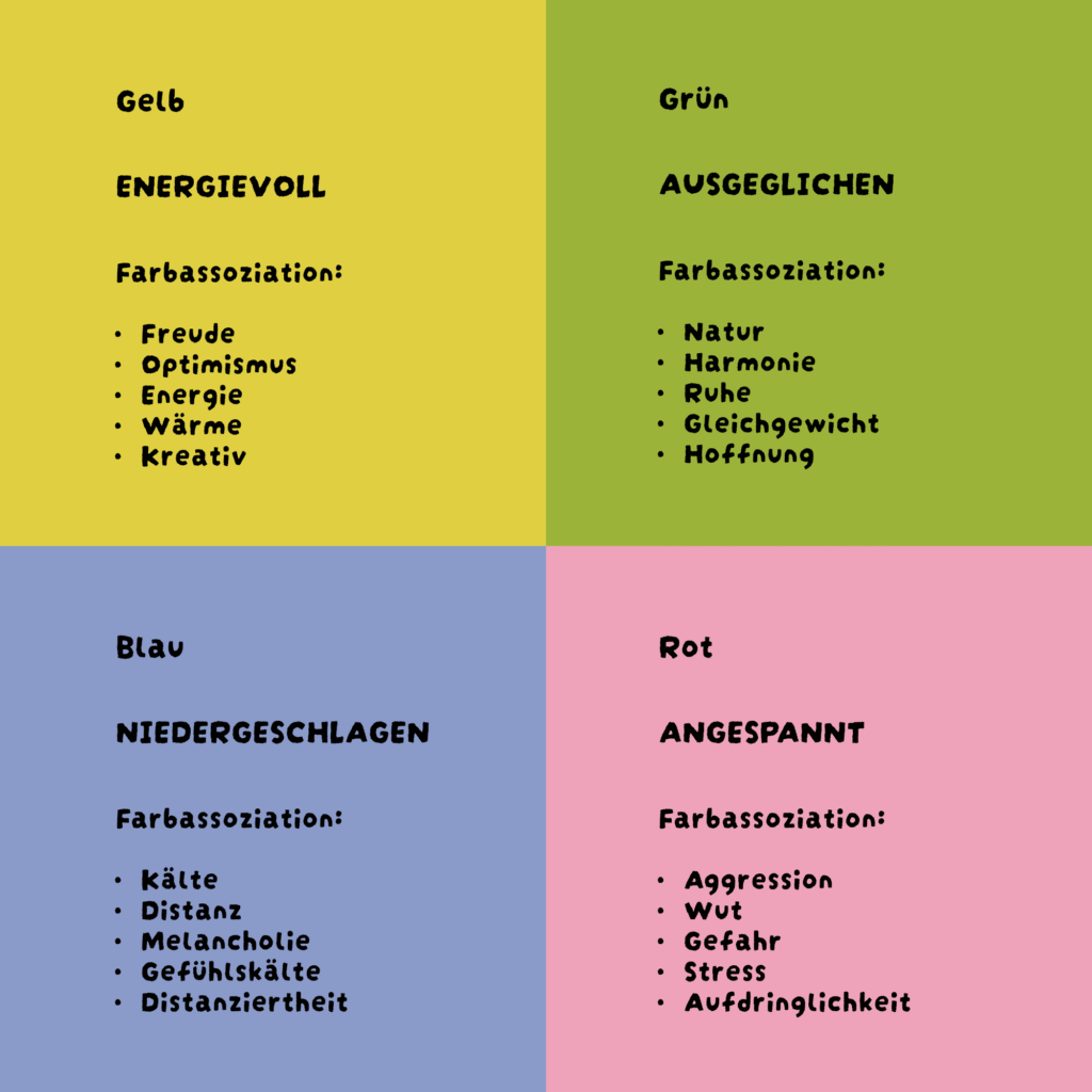 Um für die vier Stimmungskategorien eine passende Farbwahl erstellen zu können, habe ich das Thema der Farbpsychologie & Farbassoziationen recherchiert.