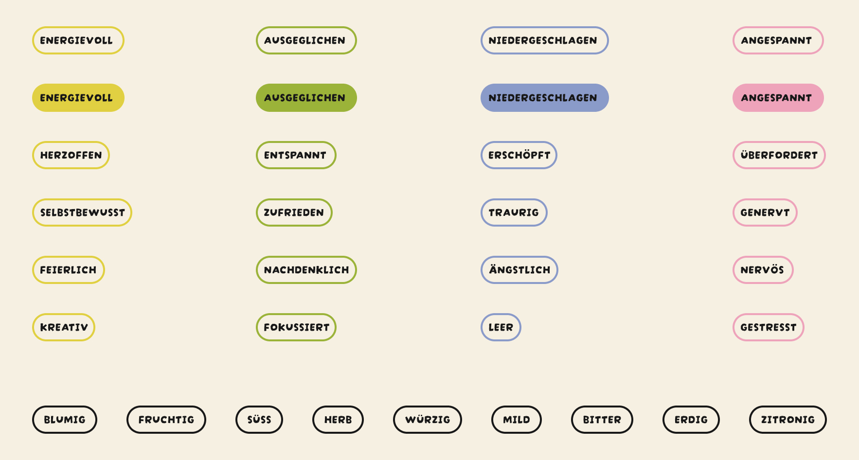 Mit Unterstützung von ChatGPT habe ich eine erste Liste erstellt, die passende Kräuter zu verschiedenen Stimmungen vorschlug. Daraus wählte ich 16 Stimmungen, die ein möglichst breites emotionales Spektrum abdecken, und ordnete sie in vier Kategorien: Energievoll, Ausgeglichen, Niedergeschlagen und Angespannt. Die Einteilung war herausfordernd, da Stimmungen oft fliessend und subjektiv sind.