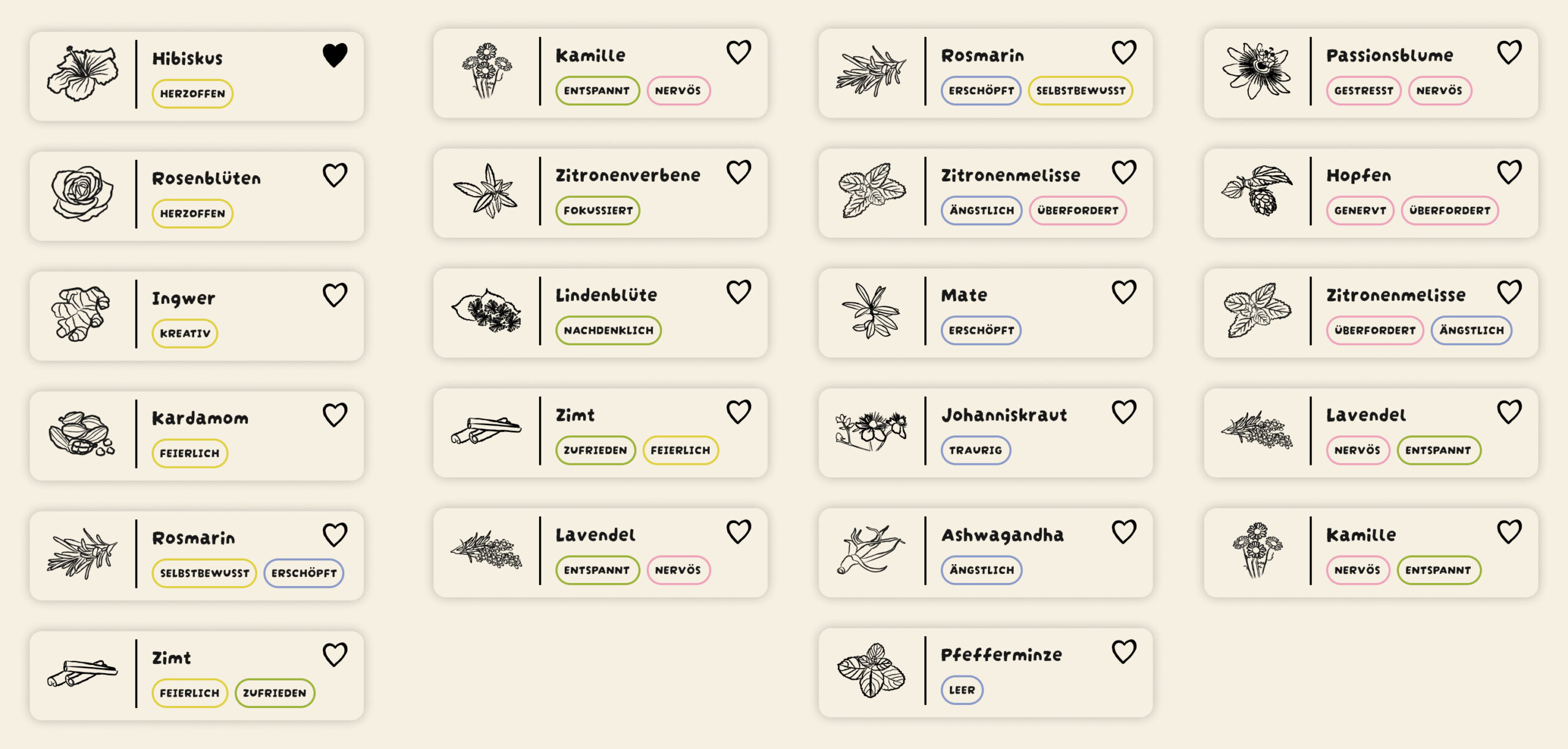 Ich habe mich schon oft mit der Wirkung von Tees und Kräutern beschäftigt, kann das Wissen aber nicht lange im Kopf behalten oder habe die passenden Zutaten nicht zuhause, deshalb greife ich im Alltag meist auf die immer gleichen fünf Teesorten zurück.